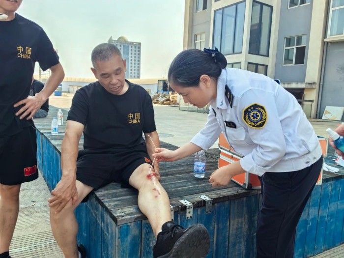 在激烈的参赛过程中,安保队长侯胜军同志不慎摔倒受伤,但他秉持“轻伤不下火线”的坚定信念,继续完成比赛。